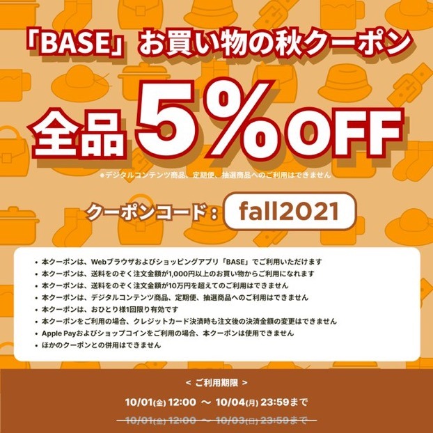 商品購入画面でクーポンコード≪fall2021≫を入力して下さい。