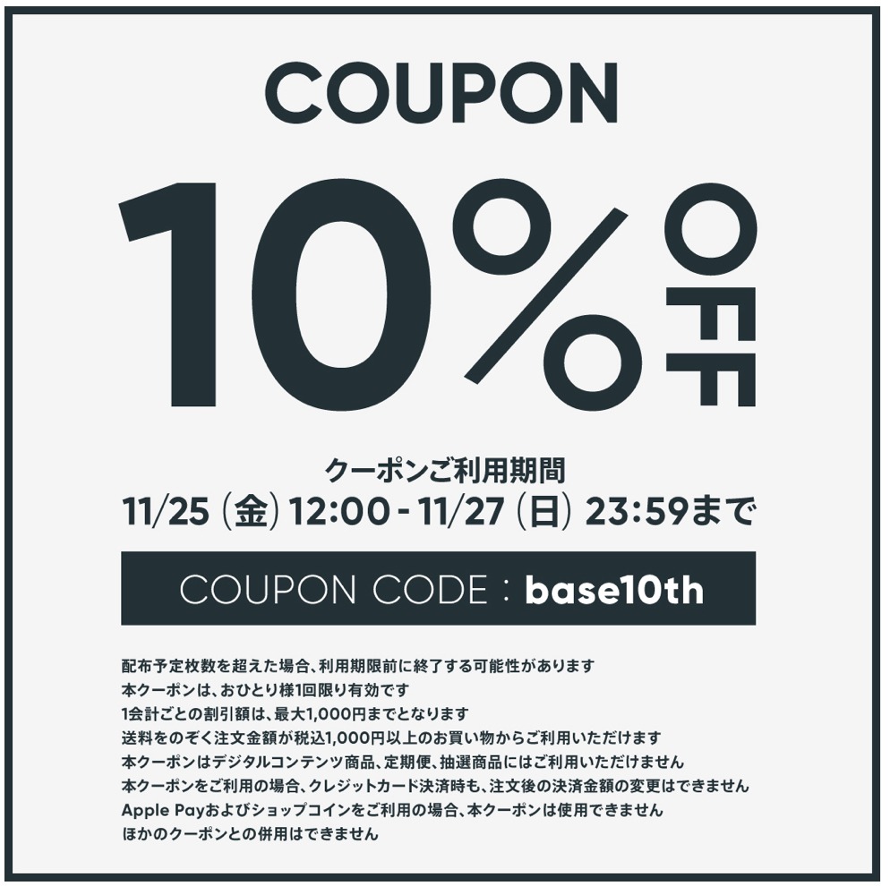 【11/25〜27限定】お得な10%OFFクーポンをプレゼント♪商品購入画面でクーポンコード「base10th」を入力してください。新作やセールアイテムにもご利用いただけます!